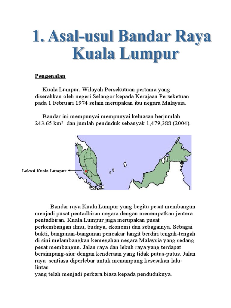 ASAL USUL NAMA MANDAILING. Kuala Lumpur yang merupakan ibu negara Malaysia telah ditubuhkan menjadi Wilayah Persekutuan pada tanggal 1 Februari 1974. Pendudukannya bermula apabila seorang ahli keluarga kerajaan Selangor Raja Abdullah membuka Lembah Klang untuk pelombongan biji timah.